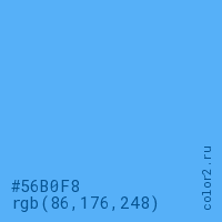 Цвет #56B0F8 в цветовой модели RGB обозначается тремя октетами (86, 176, 248) в десятичном формате и #56B0F8 в шестнадцатиричном (hex) формате, которые являются интенсивностью красного 86 (hex 56), интенсивность зелёного 176 (hex B0) и интенсивность синего 248 (hex F8).