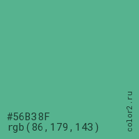 Цвет #56B38F в цветовой модели RGB обозначается тремя октетами (86, 179, 143) в десятичном формате и #56B38F в шестнадцатиричном (hex) формате, которые являются интенсивностью красного 86 (hex 56), интенсивность зелёного 179 (hex B3) и интенсивность синего 143 (hex 8F).