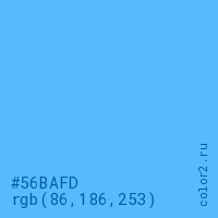 Цвет #56BAFD в цветовой модели RGB обозначается тремя октетами (86, 186, 253) в десятичном формате и #56BAFD в шестнадцатиричном (hex) формате, которые являются интенсивностью красного 86 (hex 56), интенсивность зелёного 186 (hex BA) и интенсивность синего 253 (hex FD).