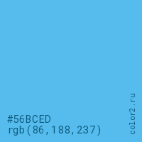 Цвет #56BCED в цветовой модели RGB обозначается тремя октетами (86, 188, 237) в десятичном формате и #56BCED в шестнадцатиричном (hex) формате, которые являются интенсивностью красного 86 (hex 56), интенсивность зелёного 188 (hex BC) и интенсивность синего 237 (hex ED).