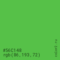 Цвет #56C148 в цветовой модели RGB обозначается тремя октетами (86, 193, 72) в десятичном формате и #56C148 в шестнадцатиричном (hex) формате, которые являются интенсивностью красного 86 (hex 56), интенсивность зелёного 193 (hex C1) и интенсивность синего 72 (hex 48).