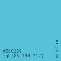 Цвет #56C2D9 в цветовой модели RGB обозначается тремя октетами (86, 194, 217) в десятичном формате и #56C2D9 в шестнадцатиричном (hex) формате, которые являются интенсивностью красного 86 (hex 56), интенсивность зелёного 194 (hex C2) и интенсивность синего 217 (hex D9).