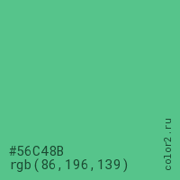 Цвет #56C48B в цветовой модели RGB обозначается тремя октетами (86, 196, 139) в десятичном формате и #56C48B в шестнадцатиричном (hex) формате, которые являются интенсивностью красного 86 (hex 56), интенсивность зелёного 196 (hex C4) и интенсивность синего 139 (hex 8B).