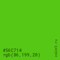 Цвет #56C714 в цветовой модели RGB обозначается тремя октетами (86, 199, 20) в десятичном формате и #56C714 в шестнадцатиричном (hex) формате, которые являются интенсивностью красного 86 (hex 56), интенсивность зелёного 199 (hex C7) и интенсивность синего 20 (hex 14).
