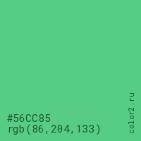 Цвет #56CC85 в цветовой модели RGB обозначается тремя октетами (86, 204, 133) в десятичном формате и #56CC85 в шестнадцатиричном (hex) формате, которые являются интенсивностью красного 86 (hex 56), интенсивность зелёного 204 (hex CC) и интенсивность синего 133 (hex 85).