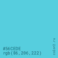 Цвет #56CEDE в цветовой модели RGB обозначается тремя октетами (86, 206, 222) в десятичном формате и #56CEDE в шестнадцатиричном (hex) формате, которые являются интенсивностью красного 86 (hex 56), интенсивность зелёного 206 (hex CE) и интенсивность синего 222 (hex DE).
