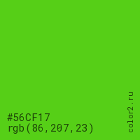 Цвет #56CF17 в цветовой модели RGB обозначается тремя октетами (86, 207, 23) в десятичном формате и #56CF17 в шестнадцатиричном (hex) формате, которые являются интенсивностью красного 86 (hex 56), интенсивность зелёного 207 (hex CF) и интенсивность синего 23 (hex 17).