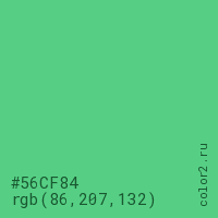 Цвет #56CF84 в цветовой модели RGB обозначается тремя октетами (86, 207, 132) в десятичном формате и #56CF84 в шестнадцатиричном (hex) формате, которые являются интенсивностью красного 86 (hex 56), интенсивность зелёного 207 (hex CF) и интенсивность синего 132 (hex 84).