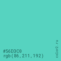 Цвет #56D3C0 в цветовой модели RGB обозначается тремя октетами (86, 211, 192) в десятичном формате и #56D3C0 в шестнадцатиричном (hex) формате, которые являются интенсивностью красного 86 (hex 56), интенсивность зелёного 211 (hex D3) и интенсивность синего 192 (hex C0).