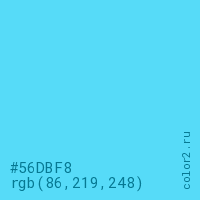 Цвет #56DBF8 в цветовой модели RGB обозначается тремя октетами (86, 219, 248) в десятичном формате и #56DBF8 в шестнадцатиричном (hex) формате, которые являются интенсивностью красного 86 (hex 56), интенсивность зелёного 219 (hex DB) и интенсивность синего 248 (hex F8).