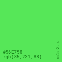 Цвет #56E758 в цветовой модели RGB обозначается тремя октетами (86, 231, 88) в десятичном формате и #56E758 в шестнадцатиричном (hex) формате, которые являются интенсивностью красного 86 (hex 56), интенсивность зелёного 231 (hex E7) и интенсивность синего 88 (hex 58).