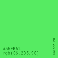Цвет #56EB62 в цветовой модели RGB обозначается тремя октетами (86, 235, 98) в десятичном формате и #56EB62 в шестнадцатиричном (hex) формате, которые являются интенсивностью красного 86 (hex 56), интенсивность зелёного 235 (hex EB) и интенсивность синего 98 (hex 62).