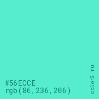 Цвет #56ECCE в цветовой модели RGB обозначается тремя октетами (86, 236, 206) в десятичном формате и #56ECCE в шестнадцатиричном (hex) формате, которые являются интенсивностью красного 86 (hex 56), интенсивность зелёного 236 (hex EC) и интенсивность синего 206 (hex CE).