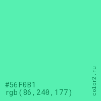 Цвет #56F0B1 в цветовой модели RGB обозначается тремя октетами (86, 240, 177) в десятичном формате и #56F0B1 в шестнадцатиричном (hex) формате, которые являются интенсивностью красного 86 (hex 56), интенсивность зелёного 240 (hex F0) и интенсивность синего 177 (hex B1).