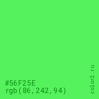 Цвет #56F25E в цветовой модели RGB обозначается тремя октетами (86, 242, 94) в десятичном формате и #56F25E в шестнадцатиричном (hex) формате, которые являются интенсивностью красного 86 (hex 56), интенсивность зелёного 242 (hex F2) и интенсивность синего 94 (hex 5E).