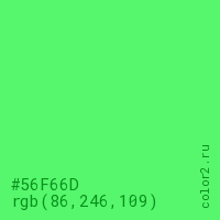 Цвет #56F66D в цветовой модели RGB обозначается тремя октетами (86, 246, 109) в десятичном формате и #56F66D в шестнадцатиричном (hex) формате, которые являются интенсивностью красного 86 (hex 56), интенсивность зелёного 246 (hex F6) и интенсивность синего 109 (hex 6D).