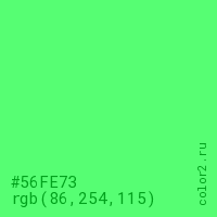 Цвет #56FE73 в цветовой модели RGB обозначается тремя октетами (86, 254, 115) в десятичном формате и #56FE73 в шестнадцатиричном (hex) формате, которые являются интенсивностью красного 86 (hex 56), интенсивность зелёного 254 (hex FE) и интенсивность синего 115 (hex 73).