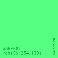 Цвет #56FE82 в цветовой модели RGB обозначается тремя октетами (86, 254, 130) в десятичном формате и #56FE82 в шестнадцатиричном (hex) формате, которые являются интенсивностью красного 86 (hex 56), интенсивность зелёного 254 (hex FE) и интенсивность синего 130 (hex 82).