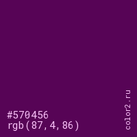 Цвет #570456 в цветовой модели RGB обозначается тремя октетами (87, 4, 86) в десятичном формате и #570456 в шестнадцатиричном (hex) формате, которые являются интенсивностью красного 87 (hex 57), интенсивность зелёного 4 (hex 04) и интенсивность синего 86 (hex 56).