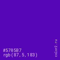 Цвет #5705B7 в цветовой модели RGB обозначается тремя октетами (87, 5, 183) в десятичном формате и #5705B7 в шестнадцатиричном (hex) формате, которые являются интенсивностью красного 87 (hex 57), интенсивность зелёного 5 (hex 05) и интенсивность синего 183 (hex B7).