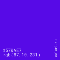 Цвет #570AE7 в цветовой модели RGB обозначается тремя октетами (87, 10, 231) в десятичном формате и #570AE7 в шестнадцатиричном (hex) формате, которые являются интенсивностью красного 87 (hex 57), интенсивность зелёного 10 (hex 0A) и интенсивность синего 231 (hex E7).