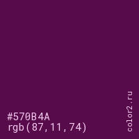 Цвет #570B4A в цветовой модели RGB обозначается тремя октетами (87, 11, 74) в десятичном формате и #570B4A в шестнадцатиричном (hex) формате, которые являются интенсивностью красного 87 (hex 57), интенсивность зелёного 11 (hex 0B) и интенсивность синего 74 (hex 4A).