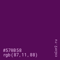 Цвет #570B58 в цветовой модели RGB обозначается тремя октетами (87, 11, 88) в десятичном формате и #570B58 в шестнадцатиричном (hex) формате, которые являются интенсивностью красного 87 (hex 57), интенсивность зелёного 11 (hex 0B) и интенсивность синего 88 (hex 58).