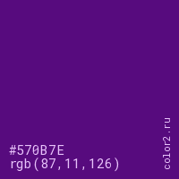 Цвет #570B7E в цветовой модели RGB обозначается тремя октетами (87, 11, 126) в десятичном формате и #570B7E в шестнадцатиричном (hex) формате, которые являются интенсивностью красного 87 (hex 57), интенсивность зелёного 11 (hex 0B) и интенсивность синего 126 (hex 7E).