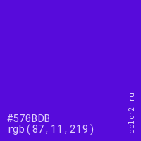 Цвет #570BDB в цветовой модели RGB обозначается тремя октетами (87, 11, 219) в десятичном формате и #570BDB в шестнадцатиричном (hex) формате, которые являются интенсивностью красного 87 (hex 57), интенсивность зелёного 11 (hex 0B) и интенсивность синего 219 (hex DB).