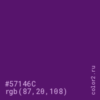 Цвет #57146C в цветовой модели RGB обозначается тремя октетами (87, 20, 108) в десятичном формате и #57146C в шестнадцатиричном (hex) формате, которые являются интенсивностью красного 87 (hex 57), интенсивность зелёного 20 (hex 14) и интенсивность синего 108 (hex 6C).