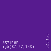 Цвет #571B8F в цветовой модели RGB обозначается тремя октетами (87, 27, 143) в десятичном формате и #571B8F в шестнадцатиричном (hex) формате, которые являются интенсивностью красного 87 (hex 57), интенсивность зелёного 27 (hex 1B) и интенсивность синего 143 (hex 8F).
