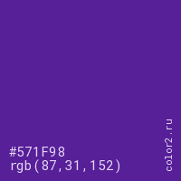 Цвет #571F98 в цветовой модели RGB обозначается тремя октетами (87, 31, 152) в десятичном формате и #571F98 в шестнадцатиричном (hex) формате, которые являются интенсивностью красного 87 (hex 57), интенсивность зелёного 31 (hex 1F) и интенсивность синего 152 (hex 98).