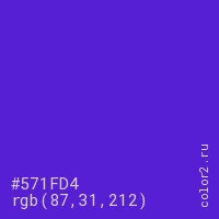 Цвет #571FD4 в цветовой модели RGB обозначается тремя октетами (87, 31, 212) в десятичном формате и #571FD4 в шестнадцатиричном (hex) формате, которые являются интенсивностью красного 87 (hex 57), интенсивность зелёного 31 (hex 1F) и интенсивность синего 212 (hex D4).