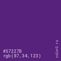Цвет #57227B в цветовой модели RGB обозначается тремя октетами (87, 34, 123) в десятичном формате и #57227B в шестнадцатиричном (hex) формате, которые являются интенсивностью красного 87 (hex 57), интенсивность зелёного 34 (hex 22) и интенсивность синего 123 (hex 7B).