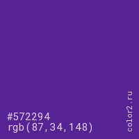 Цвет #572294 в цветовой модели RGB обозначается тремя октетами (87, 34, 148) в десятичном формате и #572294 в шестнадцатиричном (hex) формате, которые являются интенсивностью красного 87 (hex 57), интенсивность зелёного 34 (hex 22) и интенсивность синего 148 (hex 94).