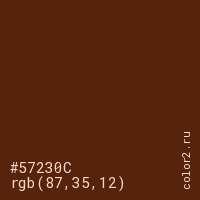 Цвет #57230C в цветовой модели RGB обозначается тремя октетами (87, 35, 12) в десятичном формате и #57230C в шестнадцатиричном (hex) формате, которые являются интенсивностью красного 87 (hex 57), интенсивность зелёного 35 (hex 23) и интенсивность синего 12 (hex 0C).