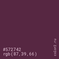 Цвет #572742 в цветовой модели RGB обозначается тремя октетами (87, 39, 66) в десятичном формате и #572742 в шестнадцатиричном (hex) формате, которые являются интенсивностью красного 87 (hex 57), интенсивность зелёного 39 (hex 27) и интенсивность синего 66 (hex 42).