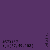 Цвет #573167 в цветовой модели RGB обозначается тремя октетами (87, 49, 103) в десятичном формате и #573167 в шестнадцатиричном (hex) формате, которые являются интенсивностью красного 87 (hex 57), интенсивность зелёного 49 (hex 31) и интенсивность синего 103 (hex 67).