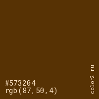 Цвет #573204 в цветовой модели RGB обозначается тремя октетами (87, 50, 4) в десятичном формате и #573204 в шестнадцатиричном (hex) формате, которые являются интенсивностью красного 87 (hex 57), интенсивность зелёного 50 (hex 32) и интенсивность синего 4 (hex 04).