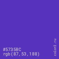 Цвет #5735BC в цветовой модели RGB обозначается тремя октетами (87, 53, 188) в десятичном формате и #5735BC в шестнадцатиричном (hex) формате, которые являются интенсивностью красного 87 (hex 57), интенсивность зелёного 53 (hex 35) и интенсивность синего 188 (hex BC).