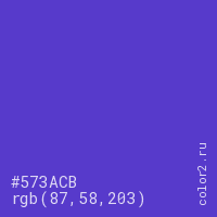 Цвет #573ACB в цветовой модели RGB обозначается тремя октетами (87, 58, 203) в десятичном формате и #573ACB в шестнадцатиричном (hex) формате, которые являются интенсивностью красного 87 (hex 57), интенсивность зелёного 58 (hex 3A) и интенсивность синего 203 (hex CB).