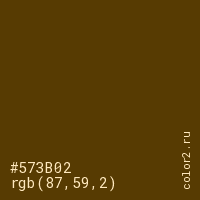 Цвет #573B02 в цветовой модели RGB обозначается тремя октетами (87, 59, 2) в десятичном формате и #573B02 в шестнадцатиричном (hex) формате, которые являются интенсивностью красного 87 (hex 57), интенсивность зелёного 59 (hex 3B) и интенсивность синего 2 (hex 02).