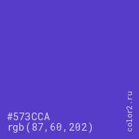 Цвет #573CCA в цветовой модели RGB обозначается тремя октетами (87, 60, 202) в десятичном формате и #573CCA в шестнадцатиричном (hex) формате, которые являются интенсивностью красного 87 (hex 57), интенсивность зелёного 60 (hex 3C) и интенсивность синего 202 (hex CA).