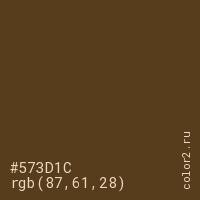 Цвет #573D1C в цветовой модели RGB обозначается тремя октетами (87, 61, 28) в десятичном формате и #573D1C в шестнадцатиричном (hex) формате, которые являются интенсивностью красного 87 (hex 57), интенсивность зелёного 61 (hex 3D) и интенсивность синего 28 (hex 1C).
