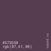 Цвет #573D50 в цветовой модели RGB обозначается тремя октетами (87, 61, 80) в десятичном формате и #573D50 в шестнадцатиричном (hex) формате, которые являются интенсивностью красного 87 (hex 57), интенсивность зелёного 61 (hex 3D) и интенсивность синего 80 (hex 50).
