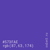 Цвет #573FAE в цветовой модели RGB обозначается тремя октетами (87, 63, 174) в десятичном формате и #573FAE в шестнадцатиричном (hex) формате, которые являются интенсивностью красного 87 (hex 57), интенсивность зелёного 63 (hex 3F) и интенсивность синего 174 (hex AE).