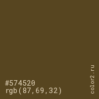 Цвет #574520 в цветовой модели RGB обозначается тремя октетами (87, 69, 32) в десятичном формате и #574520 в шестнадцатиричном (hex) формате, которые являются интенсивностью красного 87 (hex 57), интенсивность зелёного 69 (hex 45) и интенсивность синего 32 (hex 20).