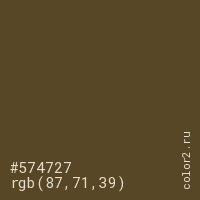 Цвет #574727 в цветовой модели RGB обозначается тремя октетами (87, 71, 39) в десятичном формате и #574727 в шестнадцатиричном (hex) формате, которые являются интенсивностью красного 87 (hex 57), интенсивность зелёного 71 (hex 47) и интенсивность синего 39 (hex 27).