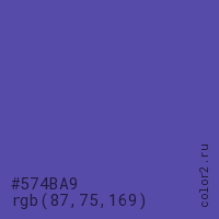 Цвет #574BA9 в цветовой модели RGB обозначается тремя октетами (87, 75, 169) в десятичном формате и #574BA9 в шестнадцатиричном (hex) формате, которые являются интенсивностью красного 87 (hex 57), интенсивность зелёного 75 (hex 4B) и интенсивность синего 169 (hex A9).