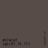 Цвет #574C47 в цветовой модели RGB обозначается тремя октетами (87, 76, 71) в десятичном формате и #574C47 в шестнадцатиричном (hex) формате, которые являются интенсивностью красного 87 (hex 57), интенсивность зелёного 76 (hex 4C) и интенсивность синего 71 (hex 47).